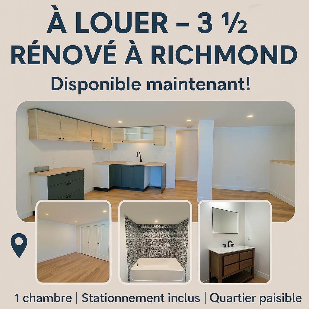 Découvrez ce superbe 3 ½ fraîchement rénové situé au 450 rue Principale Nord, à Richmond, disponible dès maintenant! Ce logement au goût du jour vous séduira par sa finition moderne, ses planchers de bois flottant chaleureux, et sa cuisine contemporaine avec armoires deux tons et robinetterie noire. Idéalement situé dans un quartier tranquille, vous serez à proximité de tous les services : épiceries, restaurants, écoles, pharmacies, parcs, et le magnifique centre-ville de Richmond. Le parc de la Rivière-aux-Canards et la piste cyclable des Grandes-Fourches sont tout près pour vos activités de plein air. Le logement offre une chambre fermée, une salle de bain spacieuse avec bain-douche au design unique, ainsi qu’un espace pour laveuse et sécheuse. La cuisine fonctionnelle est ouverte sur le salon, créant une aire de vie conviviale et lumineuse. Entrées laveuse/sécheuse Chauffage électrique 1 stationnement extérieur inclus Animaux : non autorisés Stationnement : 1 espace extérieur inclus Avantages du logement : ✅ Complètement rénové à neuf ✅ Cuisine et salle de bain modernes ✅ Grande chambre avec rangement ✅ Quartier calme à proximité des services ✅ Disponible immédiatement Conditions : Bail minimum de 12 mois Références et vérification de crédit requises N’hésitez pas à nous contacter pour plus d’informations ou pour planifier une visite : Téléphone : 819-803-4100 Courriel : [email protected]